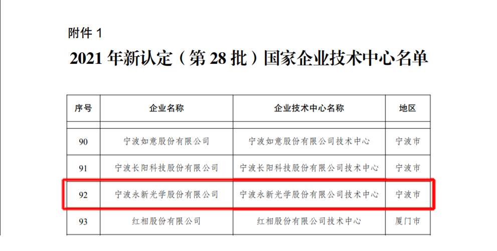 近日,國家發(fā)展和改革委員會等部門發(fā)布《關(guān)于印發(fā)2021年(第28批)新認(rèn)定及全部國家企業(yè)技術(shù)中心名單的通知》,正式公布2021年(第28批)新認(rèn)定國家企業(yè)技術(shù)中心名單,永新光學(xué)成功入選。這是公司獲得的又一項國家級榮譽(yù),永新光學(xué)科研創(chuàng)新能力再獲國家認(rèn)可!